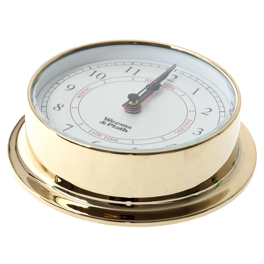 The brass Weems & Plath Endurance 125 Time and Tide Clock features a combination quartz time and tide movement. The tide sector averages the Atlantic lunar tide cycle. The easy-to-read dial, maintenance-free finish and splash resistant construction make this generous size instrument one of Weems & Plath’s most popular. As part of the extensive Endurance Collection, this time and tide clock features an ultra-hard finish guaranteed to never tarnish. The patented Slide-n-Lock Mounting System eliminates the need for visible mounting screws and is easily removed for adjustments and battery replacement.